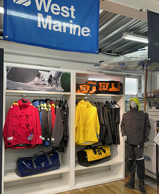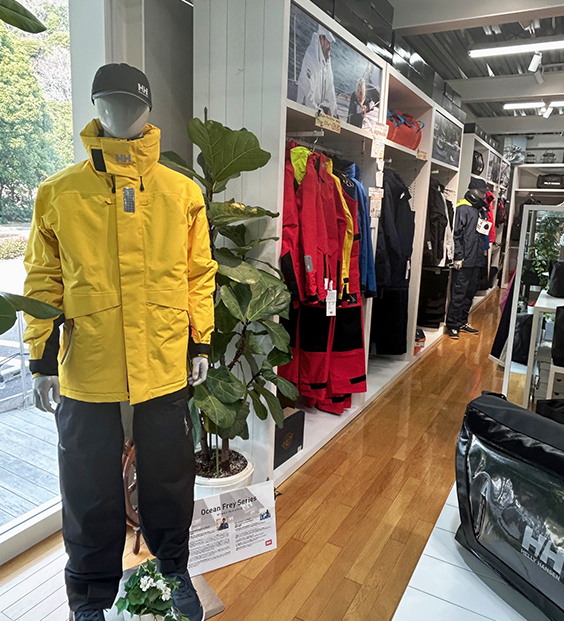 HHシーギアの象徴である防水セイリングウエア(各種カッパ)のコーナーは品揃いが充実しています。(マーキング対応商品)