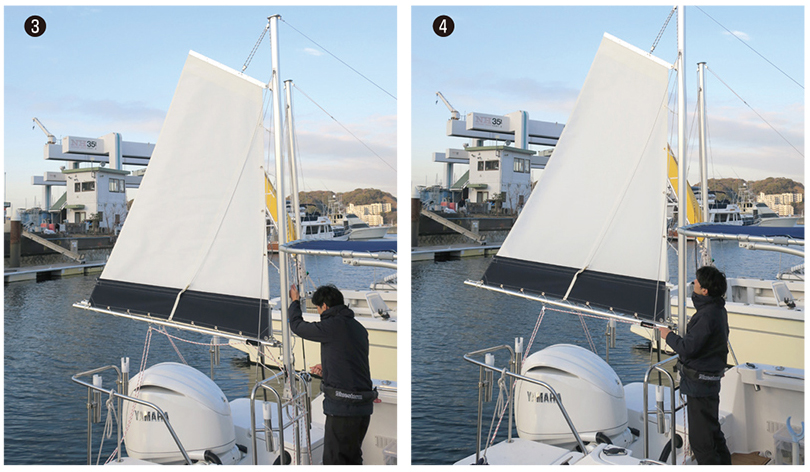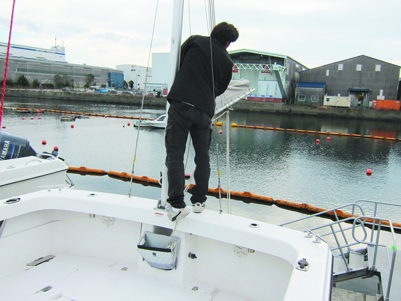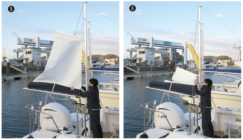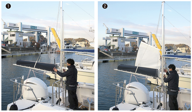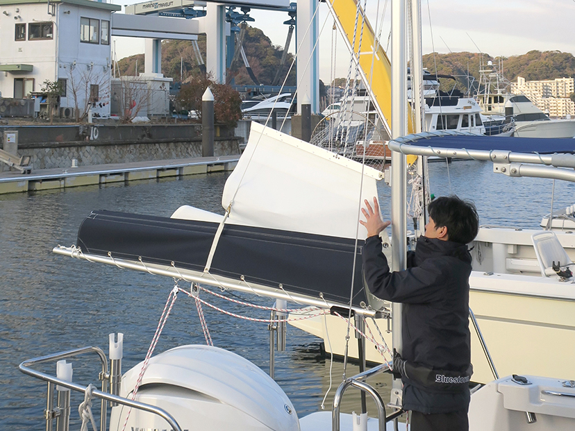 船尾レールの上に乗ると落水の危険があるのでデッキ上で操作が可能なシステムを開発しました。また、カバーの中にセイルが収納できるので、風によるバタつきや紫外線による劣化を抑えることができます。(黒いロープでファスナーの開け閉めをします)