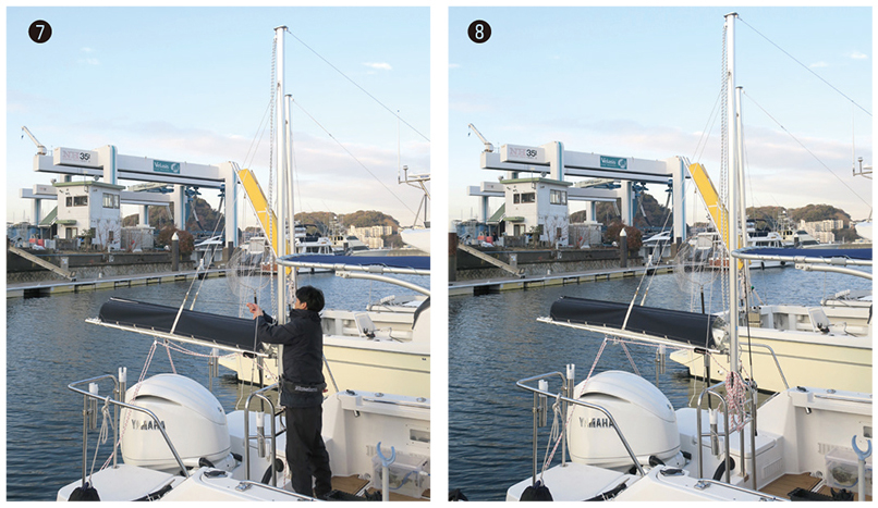 ❺❻桁シートを緩め、開き止めロープを引いて桁2本を閉じます。そしてセイルをセイルパックに収納しながら下ろします。
