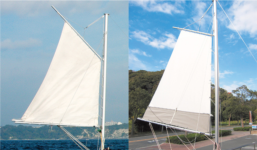 落水防止用として開発したセイルパック(船尾レールの上に乗ると落水の危険があるのでデッキ上で操作が可能なシステムを開発)。 また、カバーの中にセイルが収納できるので風によるバタつきや紫外線による劣化を抑えることができます。