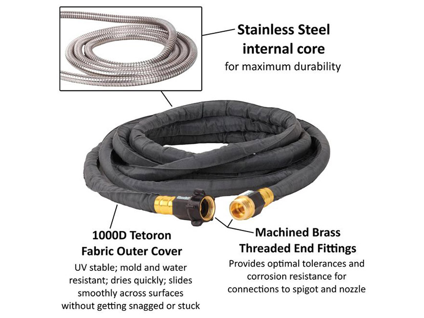 ステンレススチールPROは、柔軟なステンレススチールコアを備えたマリングレードのホースです。優れた強度と容易な巻き取りを実現します。機械加工された真鍮製のネジ付きエンドフィッティングは、耐腐食性があり、ノズルへの接続を容易にし、カバーはUV耐性のある1000Dテトロン生地で作られています。この素材は優れた耐摩耗性と色あせにくさが特徴でカビや水に強く、速乾性があり、引っかかることなくデッキ上をスムーズに滑るように設計されています。