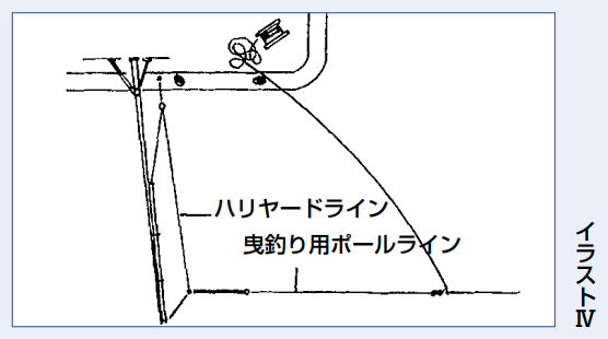 一般的に曳釣りの場合は、操船者がアウトリガーポールのトップを見て魚がかかっているのを知ることが多いので、運転席から見やすいポール位置が良いとされています。(イラストⅣ)では、曳釣り用ポールラインをハリヤードラインに接続する形で使用し、トローリング(スポーツフィッシング)にすぐに切り替えられるように、セットされています。専業になると、少しでもトラブル率を減少させるため、ポールのトップに直接セットする場合が多いようです。
