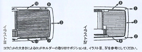 ロッドホルダーをフィッティングする場合、自分のボートのコクピットの大きさを考慮して、イラストⅠを参考にベーシックな位置にセッティングすればよいと考えます。そこで、個別のロッドホルダーについて解説することにいたしました。