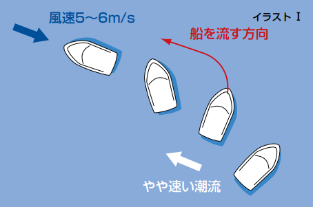 今日の対象魚はカワハギ、水深30m前後を攻めるのですが、竿の調子からオモリのサイズは25号がベスト。しかし現状から判断すると、どうやら潮流が速いので少し無理があるようです。今日の漁場は、北北東の風5〜6m/s、船首を風上に向けて停止してもすぐに風下に落とされ、アッという間に横に向いてしまう状況。操船者が前進を入れて流されるのを防止しても、スパンカーがないため船首は風下に落とされてしまいます(常に前進していれば別ですが)。潮流は風と逆の方向から流れ、これでは船を制御しない限り釣りにならない状況です。ボトムフィッシングの仕掛けは潮流の方向に流れます。したがって船を流したい方向も潮流の方向になるので、船を流す方向はイラストⅠで示すように、風上の方向に流されなければならないことになります。