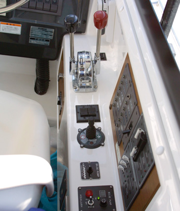 室内の運転席コントロール部分。前からエンジンコントロール、トリムタブのコントロール、そしてジョイスティック型のバウスラスターのコントロールです。