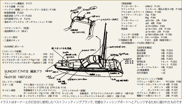 このように数々の艤装が施されたSUNCAT-7.7HTⅢ。製造メーカーのコンセプトをよく理解し、性能や構造的な部分を破壊しないように考えて、フィッシングの目的に合う艤装品を選び出し、無駄のない艤装を完成させることができたと確信しております。日本の海に合った沿岸でのフィッシングボートとして、さらに魅力が増していき、楽しいボートライフをおくることができるはずです…