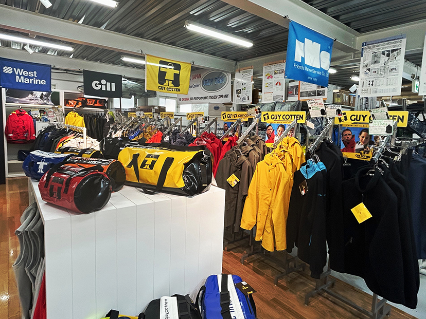 HHシーギアの象徴である防水セイリングウエア(各種カッパ)のコーナーは品揃いが充実しています。(マーキング対応商品)