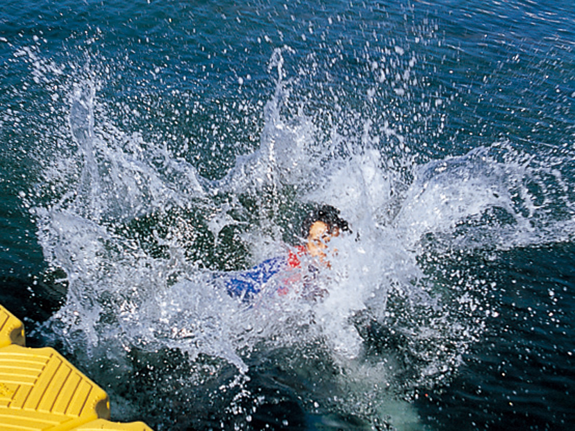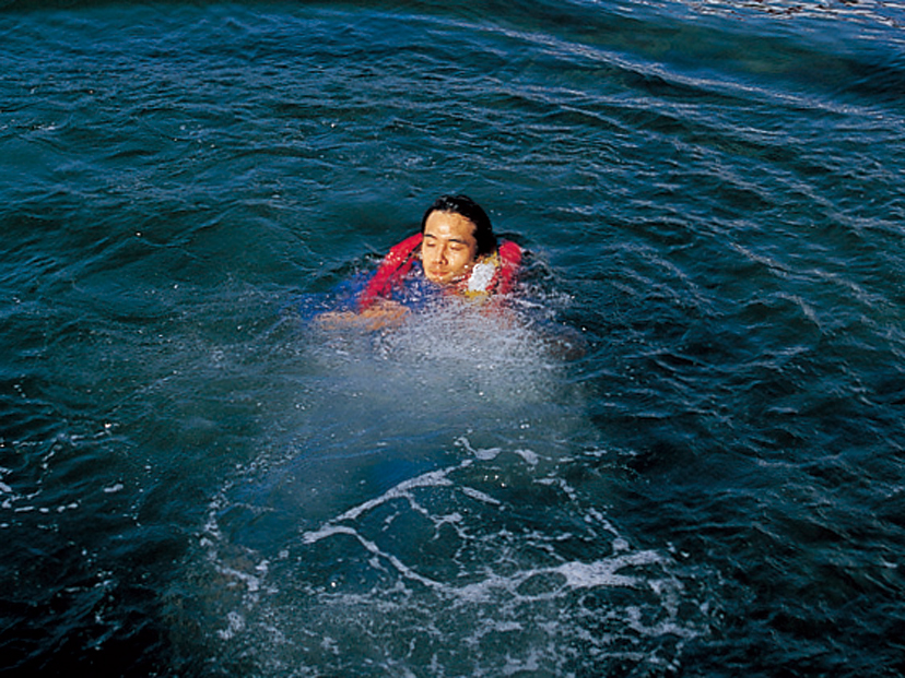 この救命衣は、落水時に水を感知して自動的に膨張し落水者を水面に浮遊させます。