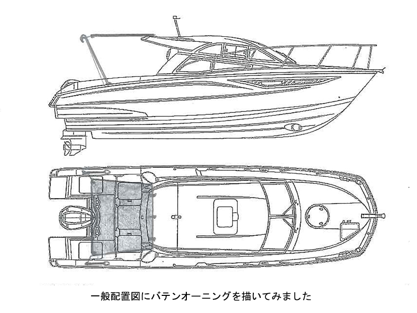 前幅1.7m×後幅2.1m×長さ1.4mサイズのバテンオーニングをサンブレラ生地で製作しテレスコハンドル(ボート フック頭部付)で装備しました。