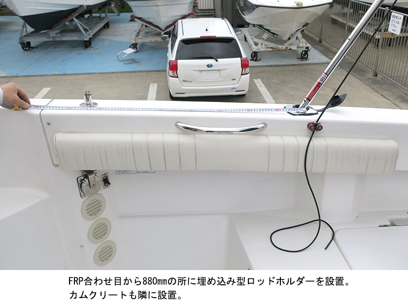 ロッドホルダーの位置によってオーニングサイズを変えることができます。幅に関しても指定サイズで製作することができますのでお見積いたします。(生地をスタモイドにすることもできます。)
