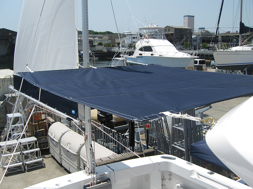 前幅1.75m×後幅1.9m×長さ2.2mサイズのバテンオーニングをサンブレラ生地で製作しスパンカーマストを利 用して装備しました。